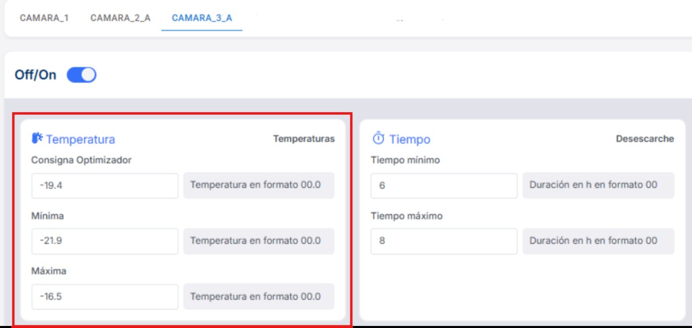 Panel del optimizador, desde el que se configura la consigna objetivo, junto con un máximo y un mínimo, entre los cuales se modulará el valor de la temperatura de corte.
